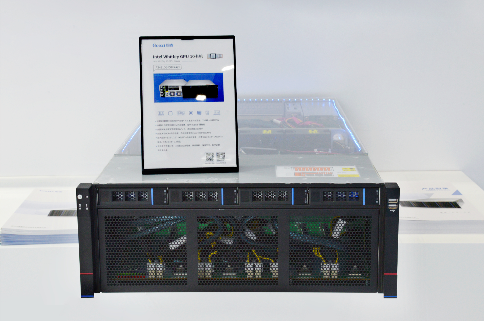此次展会展出的Gooxi Intel Whitley 4U10卡GPU服务器具备性能卓越、架构灵活、扩展性强、配置丰富和可靠性高等特点,支持2颗第三代至强系列可扩展处理器,4U空间内搭载10张高算力GPU卡能够为AI训练任务给予给予强大的X86处理平台针对推理及训练应用,这其中包括英伟达A800,GeForce RTX30系列显卡,后置4个硬盘可以选配NVMe SSD,有效提高数据的传输存储效率,支持高速网络,存储和其他IO扩展。既可以覆盖大模型、高带宽需求的高算力训练场景和高并行的HPC科学计算场景,也可以覆盖部署大模型的数据中心级推理场景。顺利获得括物联网、大数据和云计算等技术,支撑能源高效互联,有效解决新能源场站的集中监控和管理,为安全、高效生产给予保障。